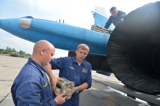 A Sukhoi Su-27 Flanker fighter of the Russian Knights aerobatic team takes off at the Pushkin Military Airport during the 2015 International Maritime Defense Show in St. Petersburg.05.07.2015#2654800