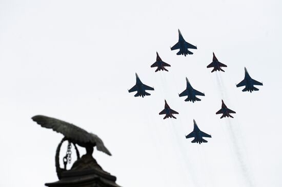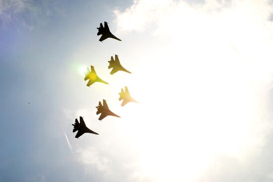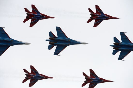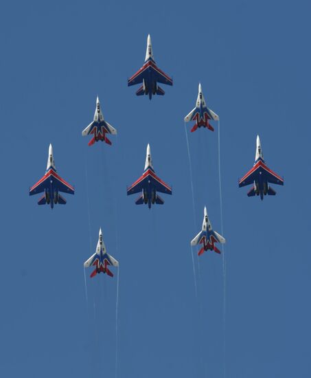 Warplanes of the Lipetsk-based Sokoly Rossii (Falcons of Russia) aerobatic display team take part in the first major rehearsal for the upcoming Victory Day Parade that involves military aircraft, unmounted parade details and a mechanized column in Alabino in the Moscow Region.16.04.2014#2413077