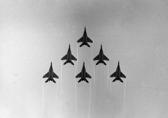 Simultaneous aerobatics being performed by the Russian Knights group, air base in Kubinka.01.08.1992#892694