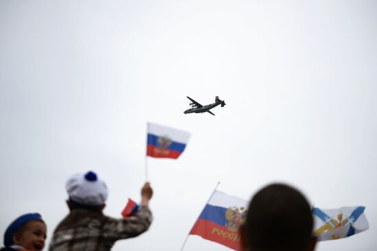 People watch an Antonov An-22 Cock strategic airlifter fly by during Victory Day parade in Sevastopol.09.05.2014#2425862