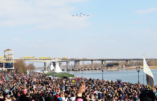 The Russian Knights aerobatics team participates in an air show of the Air Force in Rostov-on-Don held as part of the event "Contract Service in the Russian Armed Forces Is Your Choice".21.03.2015#2591892