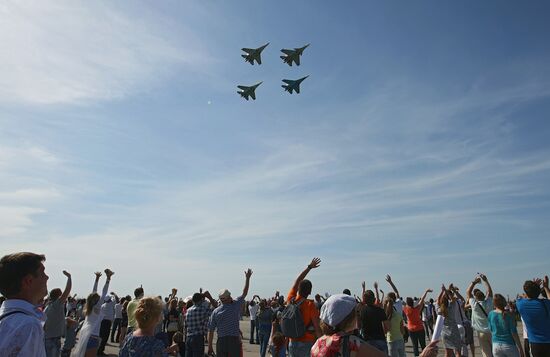 Visitors watch performance by the Russian Falcons aerobatic display team during an air show at the Krasnodar Central aerodrome during the promotional event "Military Service in the Russian Armed Forces Is Your Choice" in Krasnodar.23.05.2015#2630421