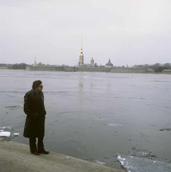 Composer Andrei Petrov on a walk along Dvortsovaya bank of the Neva River across from the Peter and Paul Cathedral.01.04.1979#525223