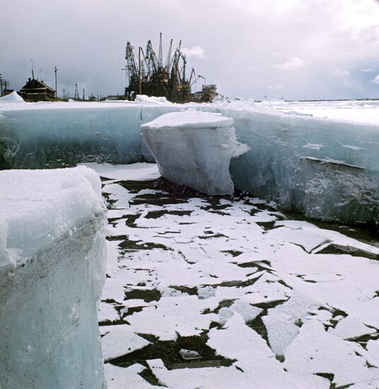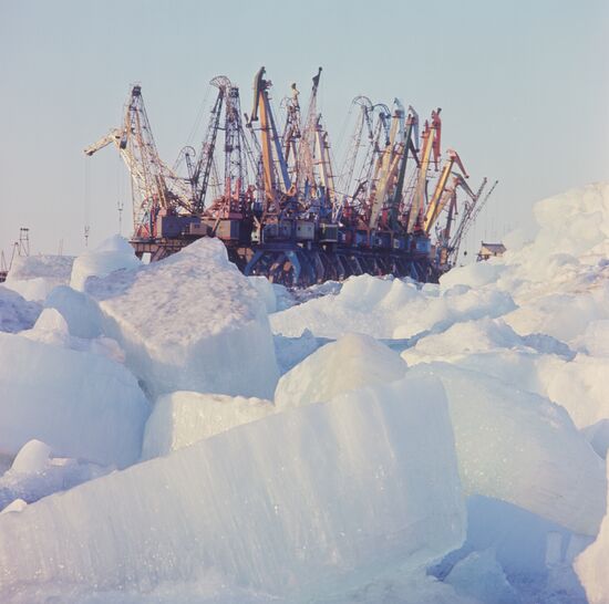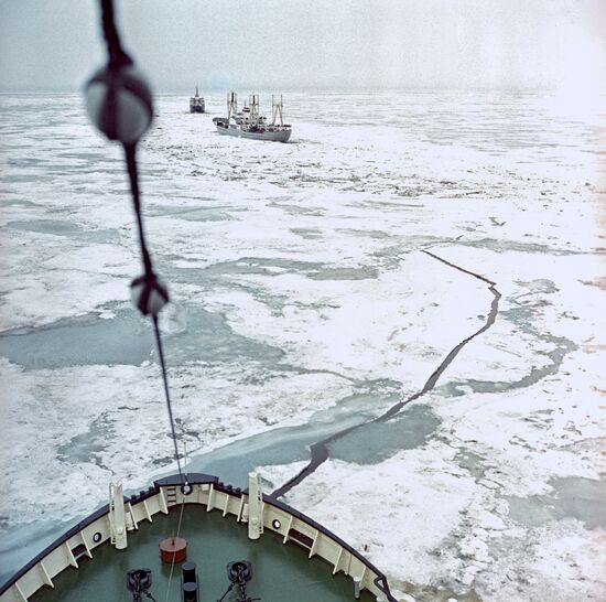 A Convoy of ships sailing along Northern Sea Route in the estuary of the Yenisei river, Dudinla port.01.02.1967#6181859