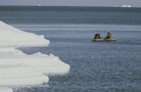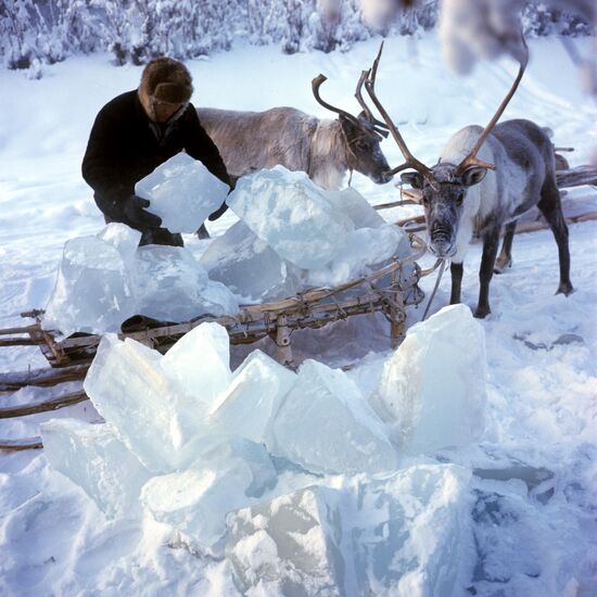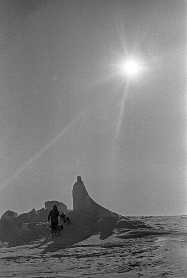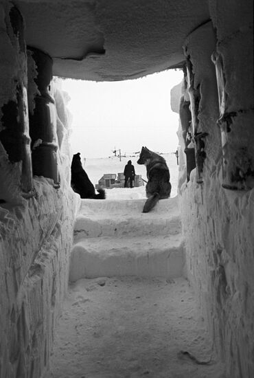 Soviet research drifting station "Severnyi Polyus-22" (North Pole-22). Launched on September 13, 1973. Laika dogs are true polar explorers' friends. The tunnel cut in snow leads to the shelter.22.06.1976#5508878