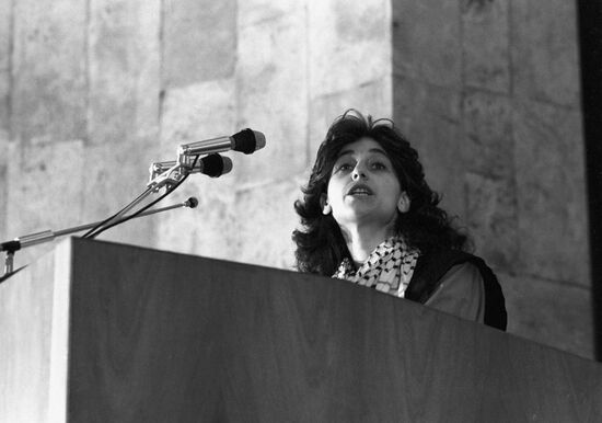 UDN student Nisreen Al-Bargutti of Palestine speaking on behalf of Arab students at a meeting of solidarity with the Libyan people at Patrice Lumumba Peoples' Friendship University.24.04.1986#834782