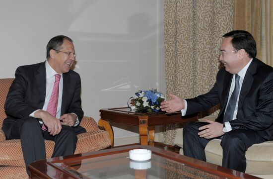 From left: Russian and Kzakhstan's Foreign Ministers Sergey Lavrov and Yerzhan Kazykhanov talking during their meeting in Almaty.13.05.2011#910103