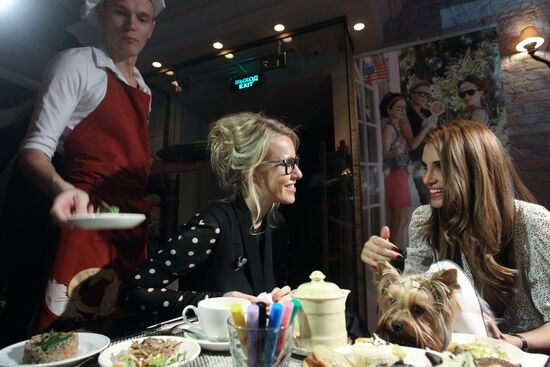 From left: TV host Ksenia Sobchak and grooming salon owner Yuna Megre with her pet at the opening of Russia's first Groom Room pet cafe of the Ginza Project Holding.19.04.2011#901486
