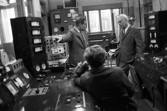The Institute of Labor Hygiene and Occupational Diseases with the USSR Academy of Sciences, presently the N F. Izmerov Research Institute of Occupational Medicine. Eduard Denisov, left, and Nikolai Kuverov study health effects of noise exposure.05.06.1972#5522079