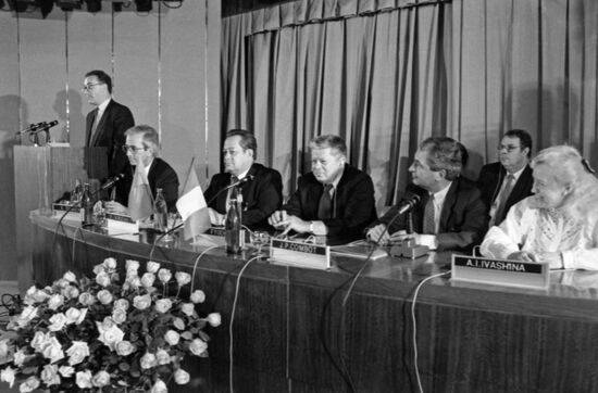Scientific conference Medical Aspects of the Chernobyl Nuclear Power Plant Accident. Ukrainian SSR, Kiev. American physician and medical researcher Robert Peter Gale, second right, and vice-president of the Soviet Academy of Medical Sciences (now the Russian Academy of Medical Sciences) Leonid Ilyin on the panel.11.05.1988#6567234