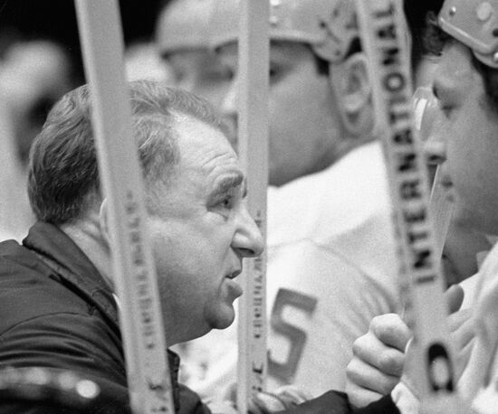 Ice hockey coach Anatoly Tarasov, Merited Coach of the USSR (center), replying to congratulations on his 70th birthday anniversary before the final match of the USSR-Czechoslovakia tournament held at the Luzhniki Sports Palace in Moscow. 15.12.1988#7126