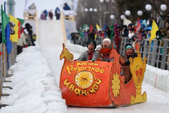 Participants of the SunnyFEST sledge art festival react as they ride a sledge of their own design, in the town of Mamadysh, Republic of Tatarstan, Russia.06.02.2021#6455235