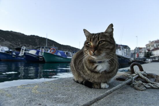 A man uses his mobile phone as seagulls fly over, on a warm winter day, in Yalta, Crimea, Russia.01.02.2021#6451144