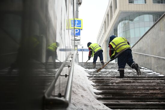 Municipal workers clear an underground passage of snow during a snowfall, in Moscow, Russia.12.02.2021#6460466