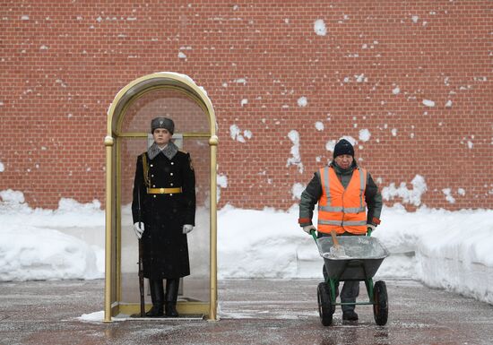 A municipal worker clears snow around the guardhouse at the Grave of the unknown soldier in the Alexander Garden near the Kremlin, in Moscow, Russia.17.02.2021#6464461
