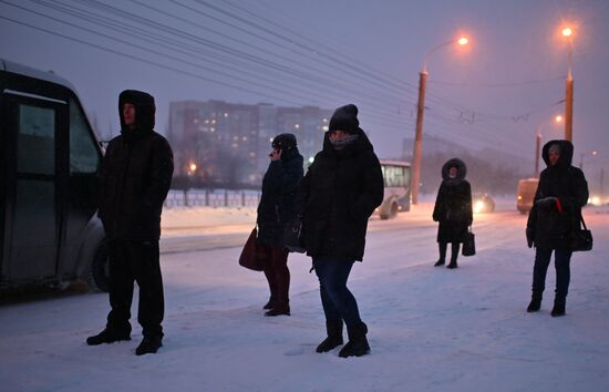 Passengers are silhouetted against the setting sun as they ride a bus on a sunny winter day, in Moscow, Russia.15.02.2021#6462942