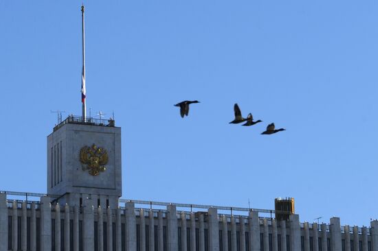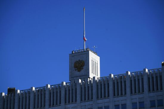 Flag on the Russian Government House flown at half-staff in memory of the Zimnyaya Vishnya shopping mall fire victims in Kemerovo.28.03.2018#5465301
