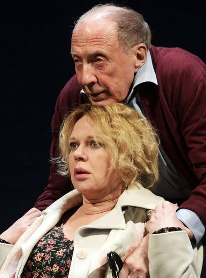 Yelena Valyushkina as Veronika Leonovna and Sergei Yursky as Roman Plotkin in a scene from Igor Vatsetis' play 'Reception' directed by People's Artist of Russia Sergei Yursky at Mossovet State Academic Theater.15.04.2018#5476111