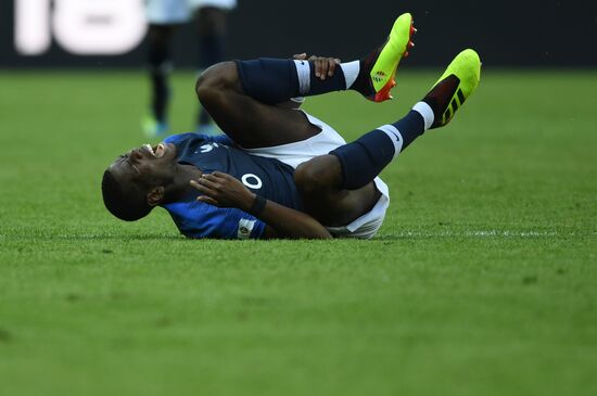 France's Paul Pogba lies on the pitch suffering after a collision during the World Cup Group C soccer match between France and Australia at the Kazan Arena in Kazan, Russia, June 16, 2018.16.06.2018#5535248