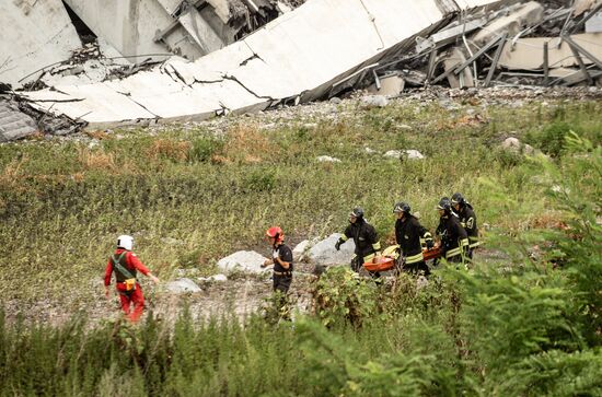 A firefighting helicopter hangs over the site of the Morandi Bridge collapse in Genoa.14.08.2018#5609876