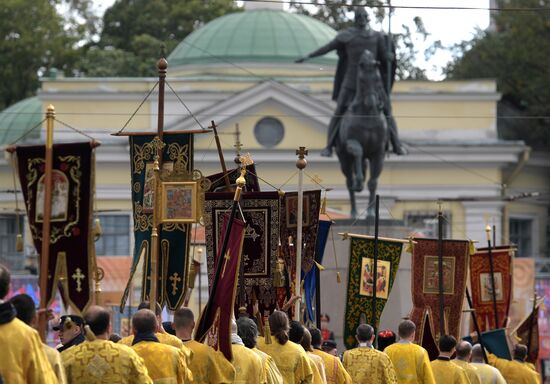 Orthodox believers take part in a procession along Nevsky Prospect marking the anniversary of the transferal of the Russian Orthodox Saint Alexander Nevsky's relics to St. Alexander Nevsky Monastery in 1724 , in St. Petersburg, Russia, September 12, 2018. 12.09.2018#5635288