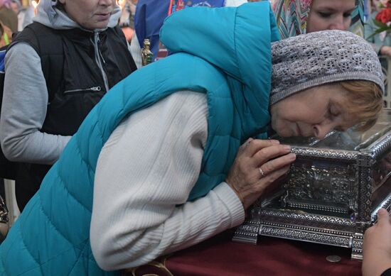 Believers kiss a reliquary with relics of Saint Spyridon, Bishop of Trimythous at Resurrection Novodevichy monastery in St. Petersburg, Russia, September 12, 2018. The relics of Orthodox Saint Spyridon were delivered from Greece to be presented for believers in 14 cities across Russia.12.09.2018#5635614