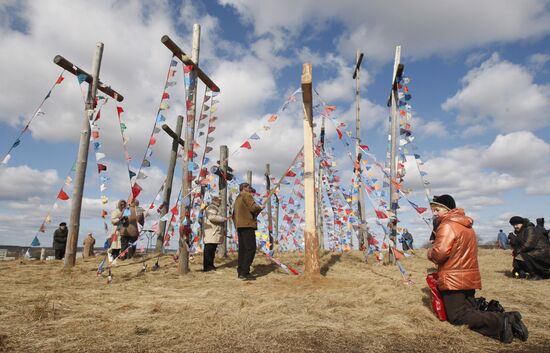 Believers get ready to carry the cross during Catholic Palm Sunday observances in the village of Oshmyani in the Grodno region of Belarus.01.04.2012#1081036