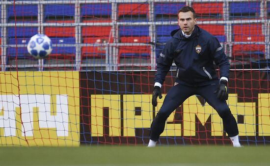 CSKA's goalkeeper Igor Akinfeev looks at a ball during a training session ahead of Champions League soccer match against Real Madrid in Moscow, Russia, October 1, 2018.01.10.2018#5653233