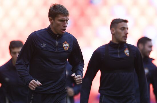 CSKA's Kirill Nababkin, left, warms up during a training session ahead of Champions League soccer match against Real Madrid in Moscow, Russia, October 1, 2018.01.10.2018#5653296