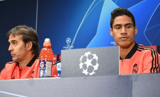 Real's head coach Julen Lopetegui, left, and Raphael Varane listen to the questions during a news conference ahead of Champions League soccer match against CSKA in Moscow, Russia, October 1, 2018.01.10.2018#5653376