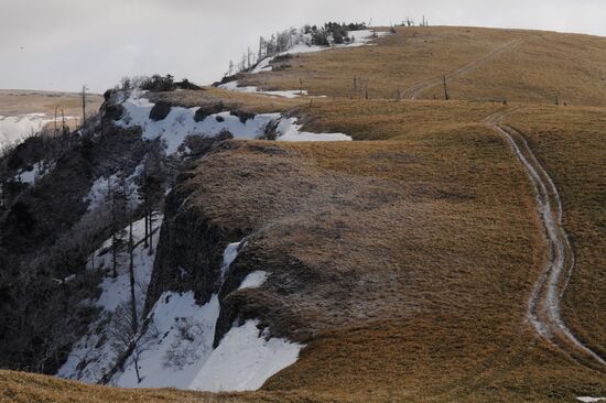 Yellow grass is seen at Shikotan island, Russia, April 2, 2018. Shikotan is the largest island of the Lesser Kuril Chain, part of the Sakhalin region in Russia. 02.04.2018#5706451