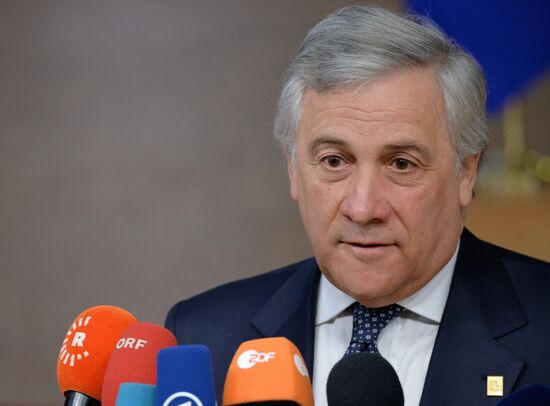 President of the European Parliament Antonio Tajani speaks to the media before the EU leaders summit in Brussels, Belgium, November 25, 2018. The leaders of 27 EU member states have endorsed the agreement and the political declaration regulating relations with the United Kingdom after the upcoming Brexit. The United Kingdom is set to depart from the European Union by late March 2019.25.11.2018#5711099