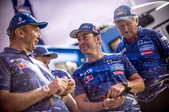 KAMAZ-master team leader Vladimir Chagin, left, speaks to Kamaz Master's driver Andrey Karginov, centre, at the Dakar rally, in Pisco, Peru. The image is a handout courtesy of a third party. Editorial use only, no archive, no commercial use.15.01.2019#5754495