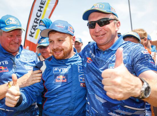 Kamaz Master's driver Dmitry Sotnikov celebrates his second place at the Dakar rally, in Lima, Peru. The image is a handout courtesy of a third party. Editorial use only, no archive, no commercial use.17.01.2019#5755398