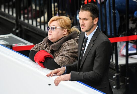 Coaches Nina Mozer and Maxim Trankov watch as Russia's Evgenia Tarasova and Vladimir Morozov skate their short programme in the pairs competition during the European Figure Skating Championships in Minsk, Belarus. 23.01.2019#5760090