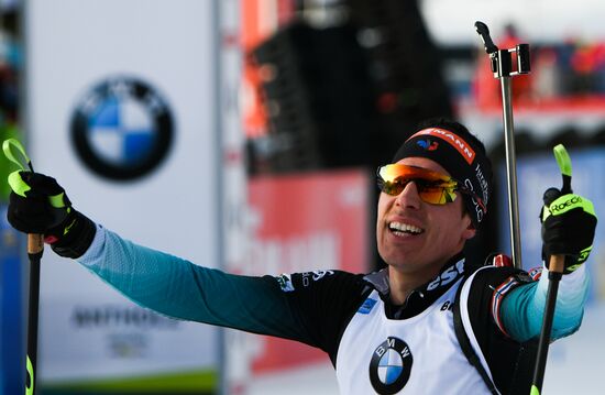 France's Quentin Fillon Maillet celebrates his third place after the men's pursuit at the World Cup biathlon in Antholz-Anterselva, Italy.26.01.2019#5763746