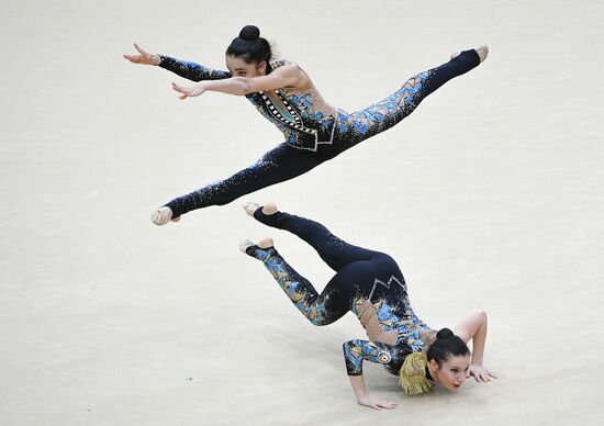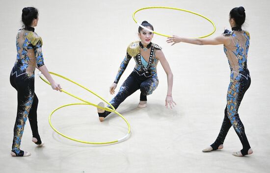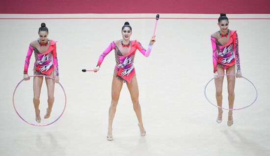 Azerbaijan's team performs their hoops and clubs routine during the Rhythmic Gymnastics Grand Prix finals in Moscow, Russia.17.02.2019#5785560