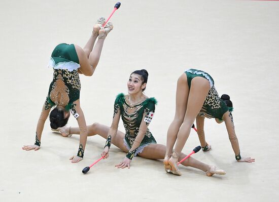 Japan's team performs their hoops and clubs routine during the Rhythmic Gymnastics Grand Prix finals in Moscow, Russia.17.02.2019#5785547
