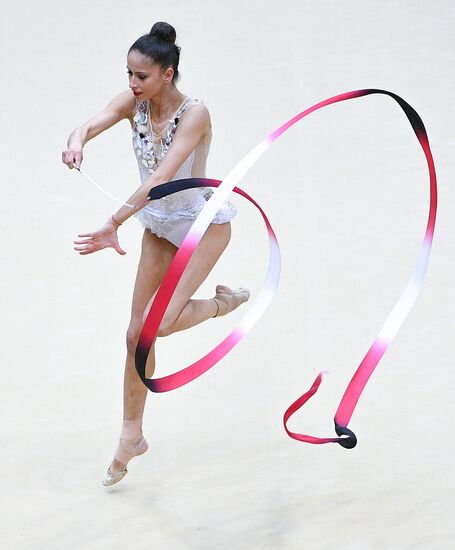 Anastasia Salos, of Belarus, performs her ribbon routine during the Rhythmic Gymnastics Grand Prix finals in Moscow, Russia.17.02.2019#5785669