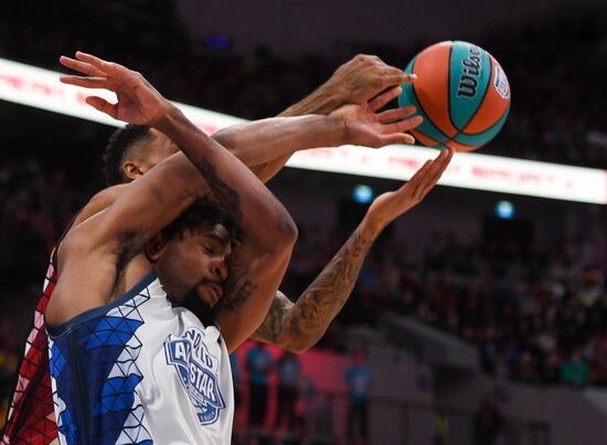 Russia Stars' Dmitriy Khvostov struggles for a ball with World Stars' Rashard Kelly during the basketball All-Star Game between Russia Stars and World Stars in Moscow, Russia. 17.02.2019#5785615
