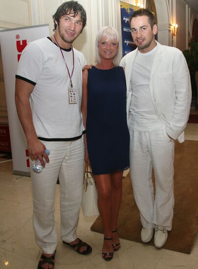 Hockey player Alexander Ovechkin, Olympic champion and State Duma deputy Svetlana Khorkina and Dmitry Nosov, winner of Olympic bronze in Athens (left to right), at a reception during the opening of the House of Olympic Friends held in the Chateau Zhang Lafitte, Beijing.09.08.2008#330117