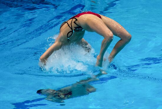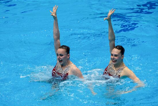 Ukraine's Marta Fiedina and Anastasiya Savchuk perform during the technical duet final at the European Artistic Swimming "Synchronised" Champions Cup competition in St. Petersburg, Russia.11.05.2019#5874979