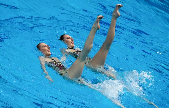 Ukraine's Marta Fiedina and Anastasiya Savchuk perform during the technical duet final at the European Artistic Swimming "Synchronised" Champions Cup competition in St. Petersburg, Russia.11.05.2019#5874976
