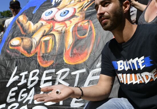 A man holds a prosthetic eye during a "yellow vests" movement's demonstration against police brutality in Paris, France. So-called yellow vest protests, named after motorists' high-visibility yellow jackets, started in mid-November 2018 and have evolved into a large-scale movement against government policies and rising living costs.02.06.2019#5901226