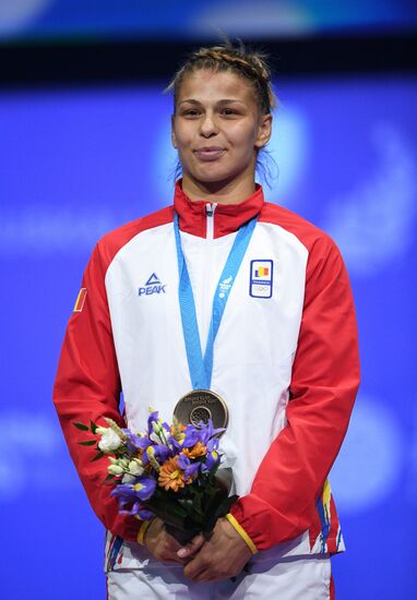 Azerbaijan's Elmira Gambarova, placed second, reacts during the awarding ceremony after the women's Greco-Roman wrestling competition at the 2nd European Games, in Minsk, Belarus.28.06.2019#5932080