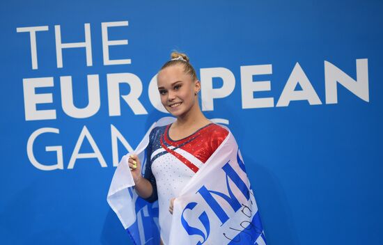 Russia's Angelina Melnikova, placed first, celebrates during the awarding ceremony after the women's all-around artistic gymnastics competition at the 2nd European Games, in Minsk, Belarus.29.06.2019#5932903