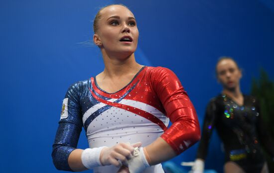 Russia's Angelina Melnikova rests after exercises on the horizontal bar during the women's all-around artistic gymnastics competition at the 2nd European Games, in Minsk, Belarus.29.06.2019#5933183