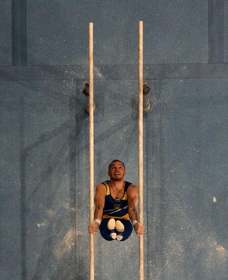 Ukraine's Petro Pakhniuk performs on parallel bars during the men's all-around artistic gymnastics competition at the 2nd European Games, in Minsk, Belarus.29.06.2019#5933251