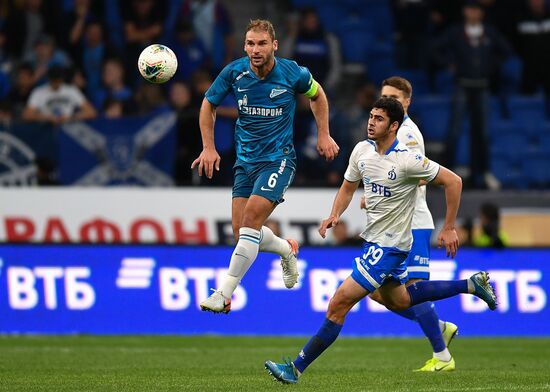Zenit's Yaroslav Rakitskiy, right, and Dynamo's Sebastian Szymanski struggle for a ball during the Russian Premier-League soccer match between Dynamo Moscow and Zenit St. Petersburg, in Moscow, Russia.10.08.2019#5972360