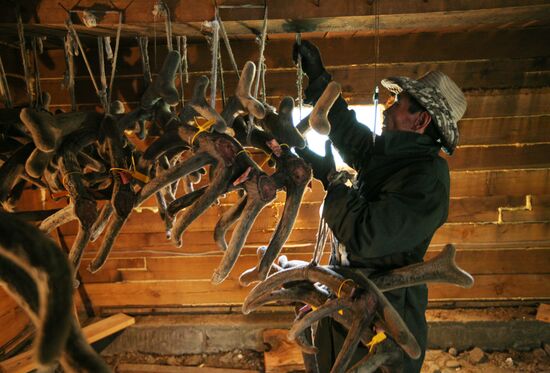 A breeder collects antlers from a heat drier. "Abaisky" farm, valley of the Yeland river, Ust-Koksinsky district, Republic of Altai.18.06.2012#1159070